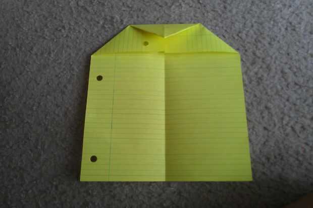 Tome su pedazo de papel y ponerlo en formato retrato (vertical). A continuación, doblar en medio "hot dog estilo" (lateral). Luego, doble hacia abajo las esquinas superiores del papel a la línea central. Por último, doble la parte superior del papel hacia abajo para crear una parte superior plana, como se muestra.