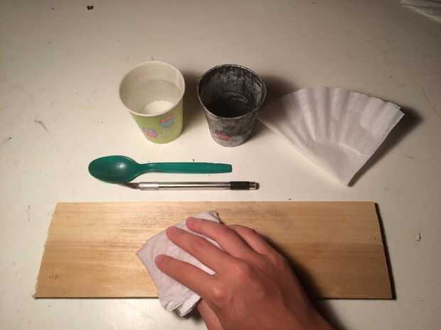 a continuación, colocar la tira en el tablero de madera y mojar la toalla de papel. Utilice la toalla de papel para humedecer la tira.