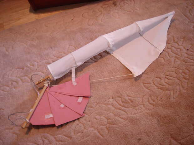 Entonces funcionó una cadena diagonal de la cabeza de caracoles más grande a un punto cerca del comienzo de la costilla de bambú largo y atado y había pegado a cada extremo para que la cadena fue enseñada. Asegúrese de que no atarla a la menor como se tire como se extiende el ala. La cadena tiene el material enseñado.