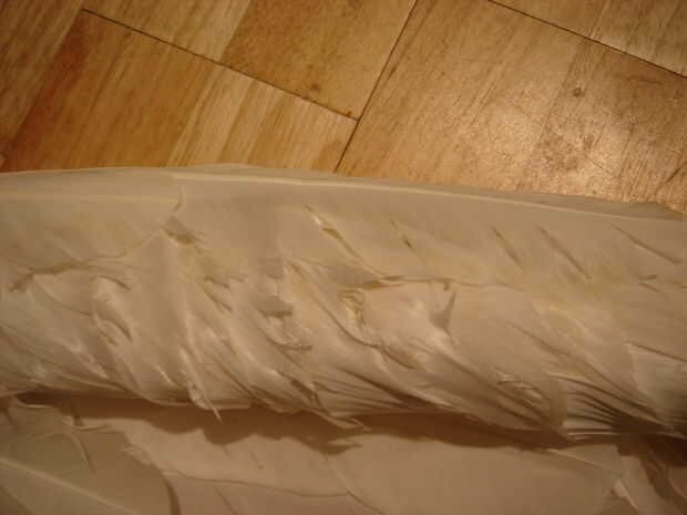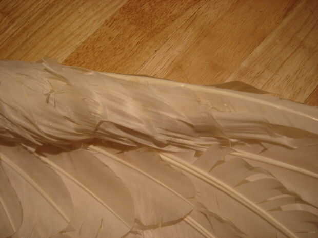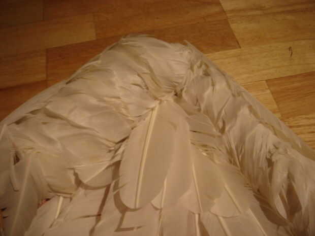 Foto1 muestra cómo hay un espacio sobre el codo del ala. Me pareció la mejor manera de cubrir este con plumas a la primera superposición el tubo final con plumas todo entonces cubierta con adornos de plumas, para que se vea como cuadros 3 y 4. Esto permite mayor flexibilidad y ajuste. Doblar los extremos de las plumas para hacer una persiana terminando para el tubo. Este bit ocurrió hace un par de va a hacer las cosas bien. Usé algunos ejes de plumas con las plumas piezas cortadas para resistencia estructural.