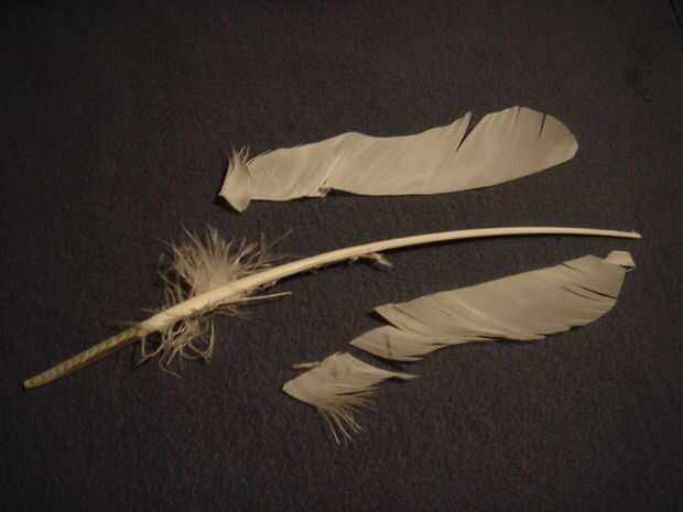 La pluma del pelado es muy frágil y fácilmente viene aparte. Si usted es paciente puede unirse nuevamente con los dedos, de lo contrario usted puede pegar los fragmentos en por separado. O les bin.