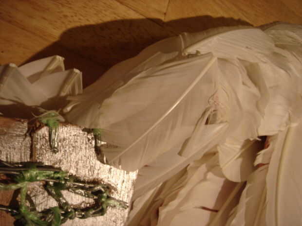 Luego cubrir la parte posterior de la placa de la misma forma que las alas. Use plumas de izquierda en las mitad izquierdas y derecha las plumas en la mitad derecha. En la parte superior doblado las plumas que le cubren la placa y largueros muy bien, (ver segunda foto, tomada desde arriba). Encontré que también se puede activar una pluma izquierda en una pluma (y v.v.) derecha doblando suavemente a lo largo de su longitud, se extenderá. En el evento que tenía exactamente el número correcto de plumas de izquierda y derecha, hasta la última de ellas; pero necesita más para hacer reparaciones después de la bola.