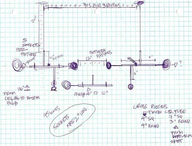 A cabo éstos hasta el techo en el comedor, ajustar varias longitudes etc, hasta que tuvimos que pensamos eran buenas dimensiones para la apariencia que deseábamos. Luego transferida a papel y bosquejó el diseño con todos los elementos individuales, y un bosquejo de Blow-up que muestra cada pieza necesitamos orden.