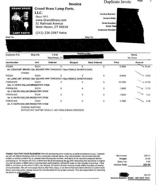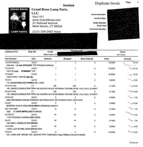 He incluido la lista de la factura y piezas de latón Grand - le dará una idea de los costos de piezas. De nada :) La única nota es incluyeron también un morir y mueren manija en el orden (artículos 3 º y 4 º en la lista), que no terminamos usando, pero estoy seguro que será para un proyecto de futuro. Un troquel es la novia del grifo – corta rosca exterior en un tubo. Necesitaría si tienes corte un tubo de latón redonda longitud personalizada y roscas en el extremo cortado.