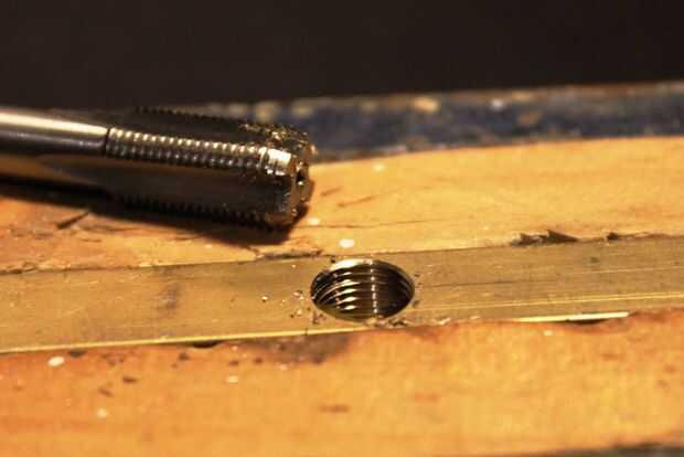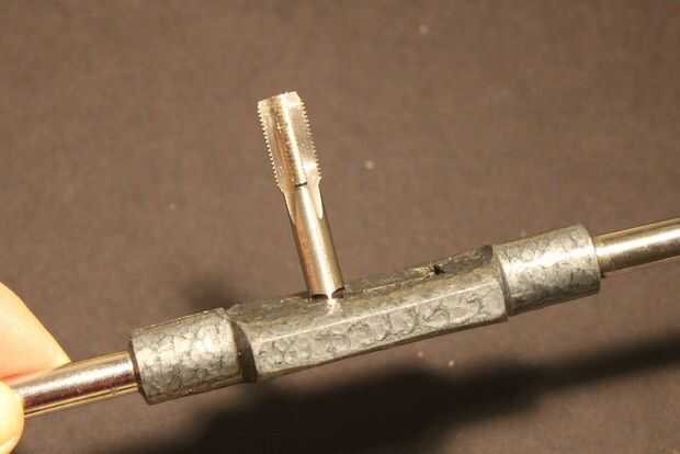 Sujeta un tubo cuadrado, colocar el grifo / manija estaba tan tan perpendicular como sea posible y lentamente gira la manija hacia la derecha para atornillar en el grifo. Generalmente, la gente que sabe que diga aflojar media vuelta por cada vuelta completa en sentido horario. Esto corta las virutas y ayuda a preservar la agudeza de la llave de corte. Longevidad de grifo suena bien para mí. También dicen que usar aceite, pero no lo hice porque el latón es bastante suave en comparación con el acero y no creo que le importa, que no lo hizo.