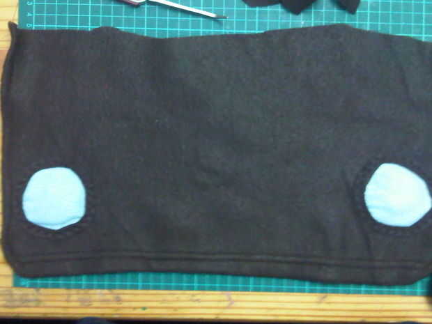 Cortar un rectángulo de lana marrón y redondear las esquinas. Este rectángulo debe ser lo suficientemente grande como para envolver alrededor de la parte posterior de la cabeza y esos pedacitos de azul deben ir sobre las orejas.