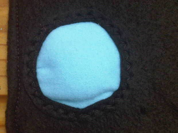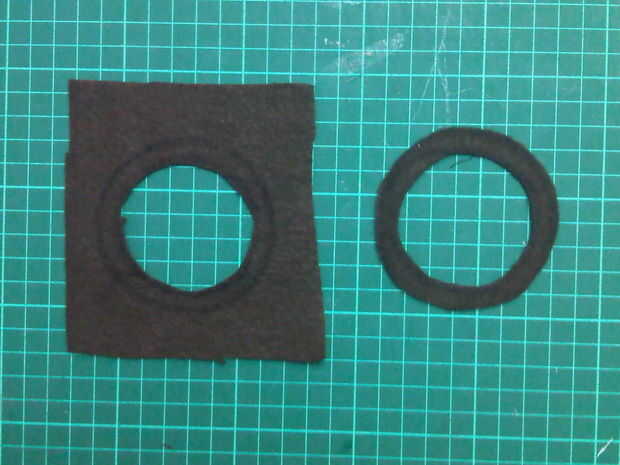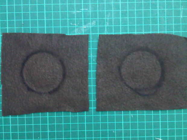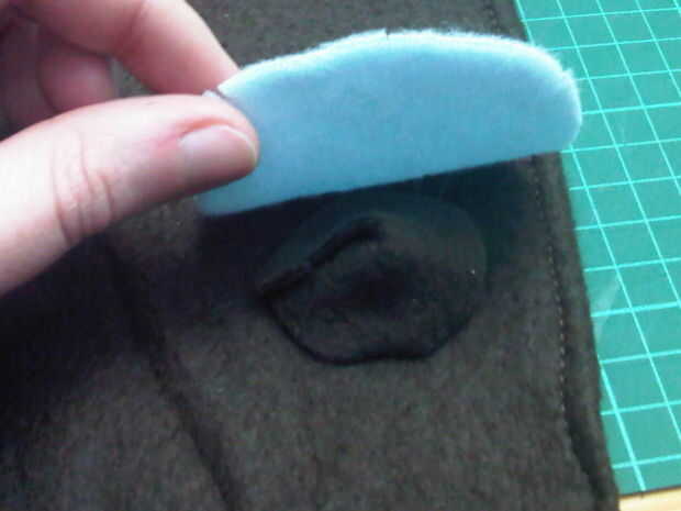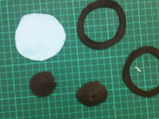 Corte dos anillos de lana marrón y dos círculos de azul paño grueso y suave del mismo tamaño. Poner el azul sobre el cono de lana marrón luego el anillo en la parte superior y la puntada hacia abajo.