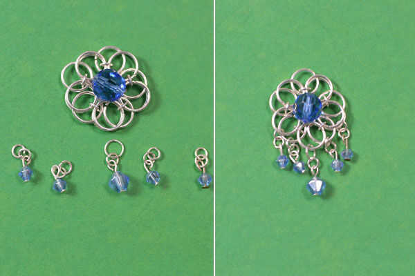 3ª, repita paso hacer otras caídas de tres bolas y vincular todas las gotas de perla para saltar anillos base como en la imagen anterior.