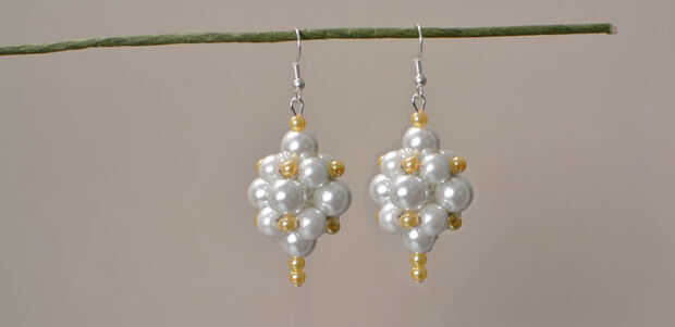 Hay cientos de diseños de pendientes de perlas en nuestro sitio Web. Proyecto DIY aretes de hoy es sobre un par de pendientes de bola perla fácil para novias. Como se puede ver en la imagen, sólo usé perlas blancos y amarillos para hacer el cuerpo principal de los pendientes con un diseño simple. A continuación está el tutorial para usted.