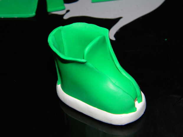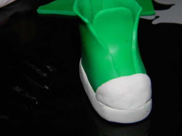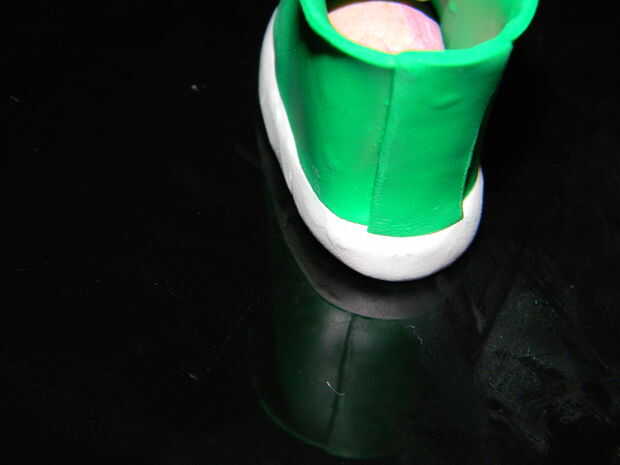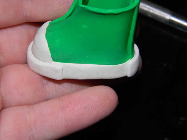 A continuación para los topes, desplegar algunos arcilla blanca y empuje sobre la parte delantera de la suela del zapato, cortar el ancho de la suela y que es ir que un poco más que el corte fuera de la cubierta del dedo del pie. El parachoques trasero se debe pasar un poco el ancho de la tira del talón.