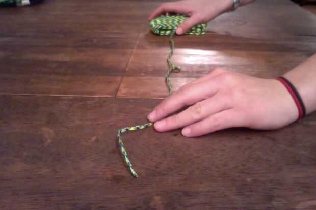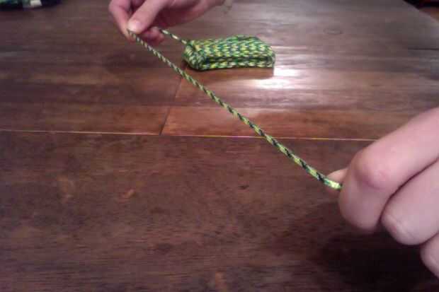 (Cuando se desvela el paracord, va fácilmente nudo si es recto de la bolsa. Tratar de suavizar la cadena como usted logra este paso.)