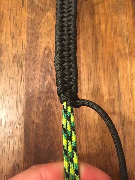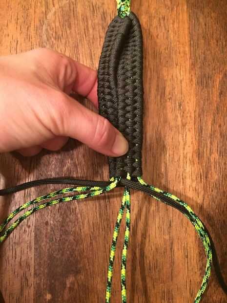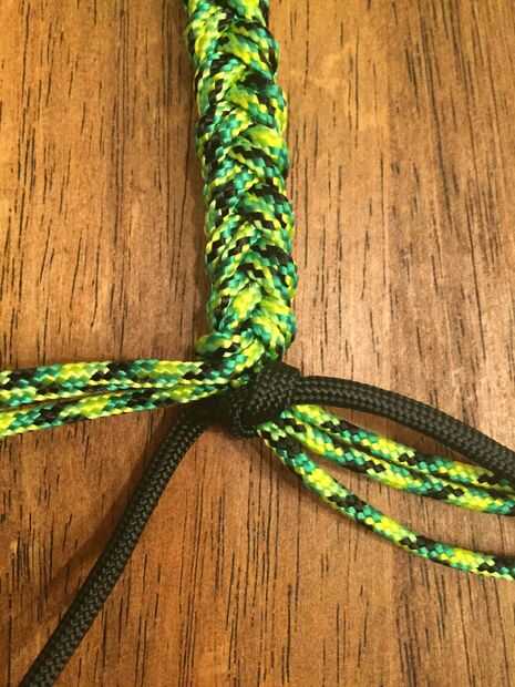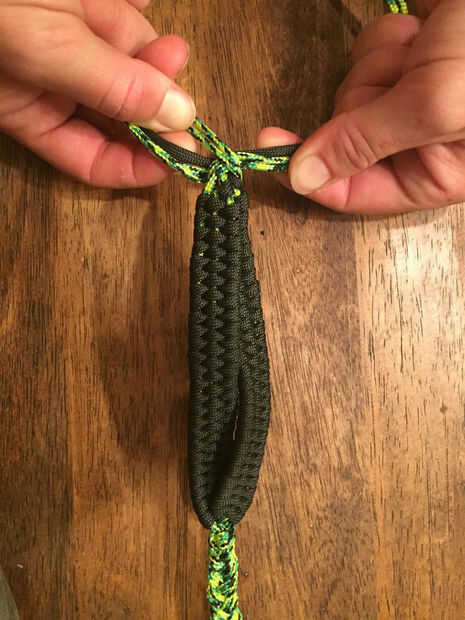 Agarra tu #550 paracord y encontrar el centro. Coloque la mitad de la cuerda #550 en 3 de las cuerdas divididas y ate un nudo fácil.