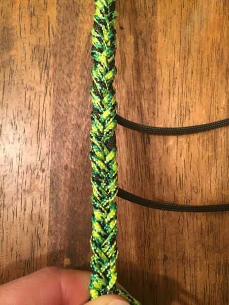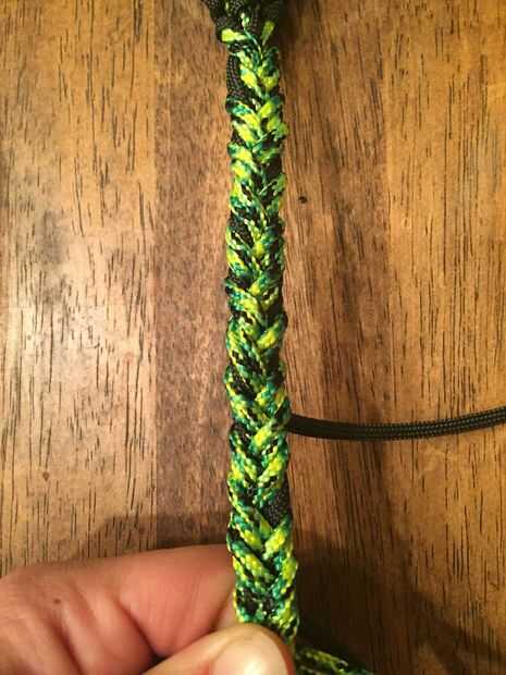 Usando la técnica de trenzado "redondo", la trenza todos los ocho filamentos para cerca de 4" o algo así. Comienza a estrechar su cable a "caer" una fuerte cada pocas pulgadas de la trenza. Es mejor soltar las cuerdas #550 primero.