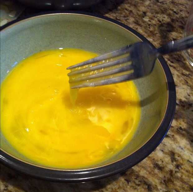 Batir los 4 huevos con un tenedor en su recipiente, hasta que el son todos mezclados.