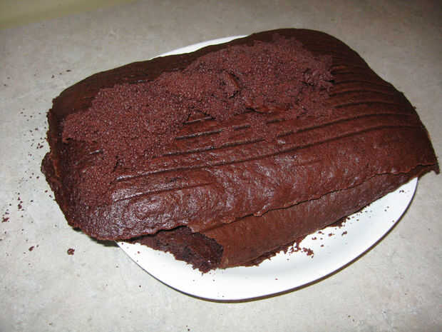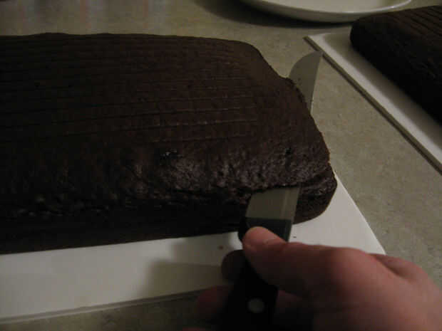 Cuidadosamente usando un cuchillo largo (o un nivelador de tarta, que he comprado derecho después de este proyecto), cortar el pastel en el mismo nivel que los bordes, todo alrededor y quitar la joroba. Puede establecer a un lado y la muestra para asegurar la calidad del producto.