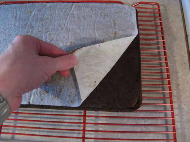 Luego coloque un estante encima de la bandeja, voltearlo boca abajo y levantar cuidadosamente el recipiente. Tu pastel debe caer hacia fuera en la bandeja de enfriamiento. Si usaste papel de pergamino se puede pelar ahora.