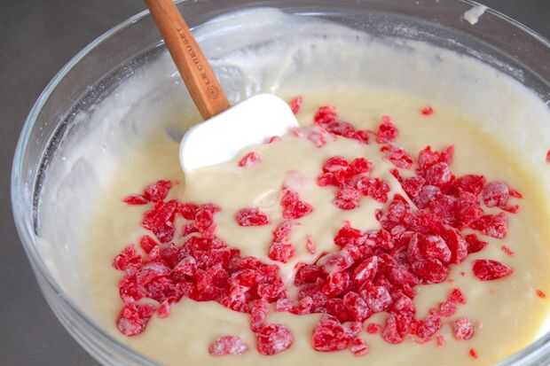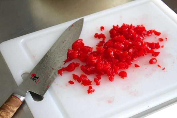 En este caso usé un tarro entero de 12 oz o cerezas al marrasquino. Yo les drena (y exprimido hacia fuera la mayor cantidad de líquido posible) y luego les picado finamente. Que luego rodé les en harina antes de añadirlos a la masa - para evitar que caigan todos en la parte inferior.