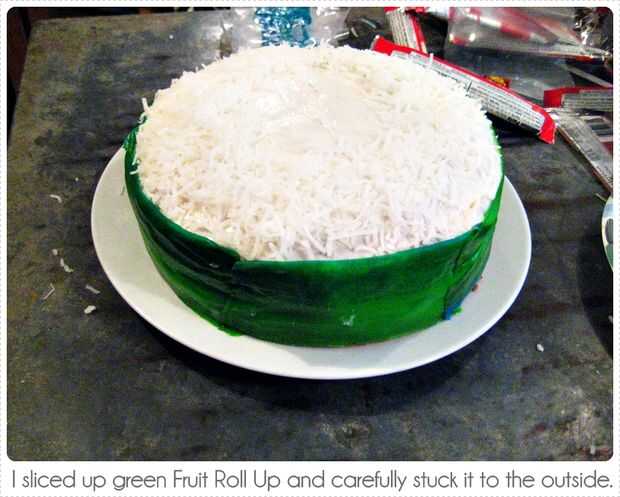 Usando un cuchillo de cocina, cortar rebanadas de fruta Roll-Up verde la parte exterior de la torta y pega cuidadosamente para el glaseado la manera entera alrededor de la torta. Asegúrese de aplicar rápidamente antes de que se caliente y pegajoso.