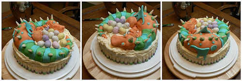 Si es de tu tarta, probablemente necesite limpiar un poco el glaseado. Solía una manga pastelera (o una bolsa de plástico con un orificio en la esquina) guinda de tubo alrededor del borde de la torta y el dragón, para ocultar los pecados o zonas donde había perturbado la base guinda en la decoración.
