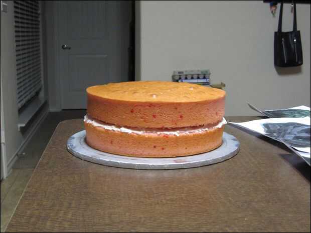 Una vez que se cuecen al horno y completamente frío, apilar las 6" tortas junto con una capa de crema en el medio y las tortas de 10" junto con una capa de crema en el medio.