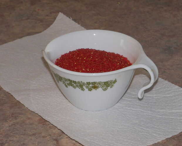 Aproximadamente 4 onzas de peso (120g) de rojo azúcar o caramelo chispitas de colores (que se encuentra en los centros urbanos canadienses más grandes en el granero a granel o en tiendas similares)