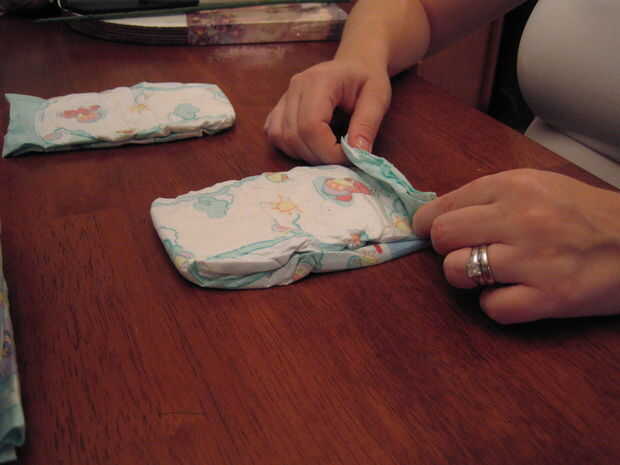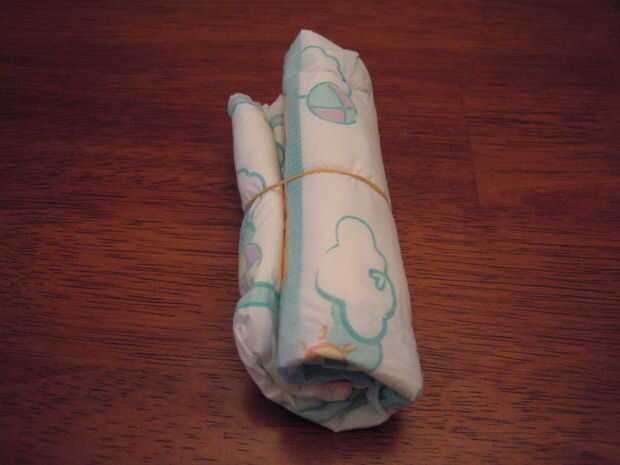 A partir de la pila de Top Tier de pañales, uno de los pañales (doblado por la mitad, tal y como sale el paquete de la subsistencia) y rodar a partir de la banda de la cintura hacia la entrepierna del pañal. Envoltura de una vez en una banda de goma alrededor de él para mantenerlo en la posición enrollada.