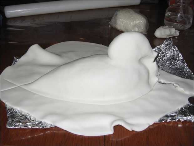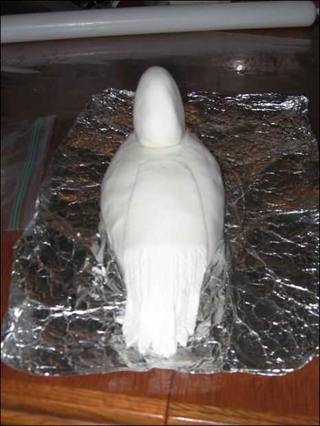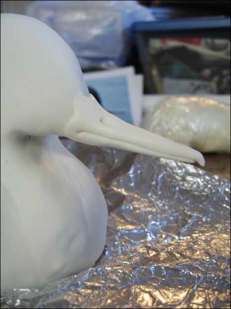 Luego añade el pincho de bambú para el pico. He cepillado algo de agua en el bambú y cubiertas con fondant. El agua actúa como un pegamento y adhiere el fondant para el bambú. Entonces detalló el pico; formar, agregando la línea donde se abriría el pico y agregando las fosas nasales.