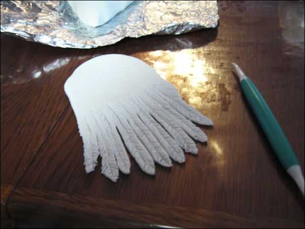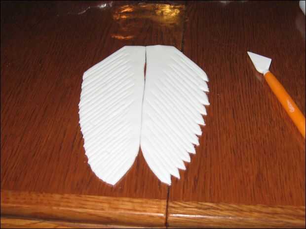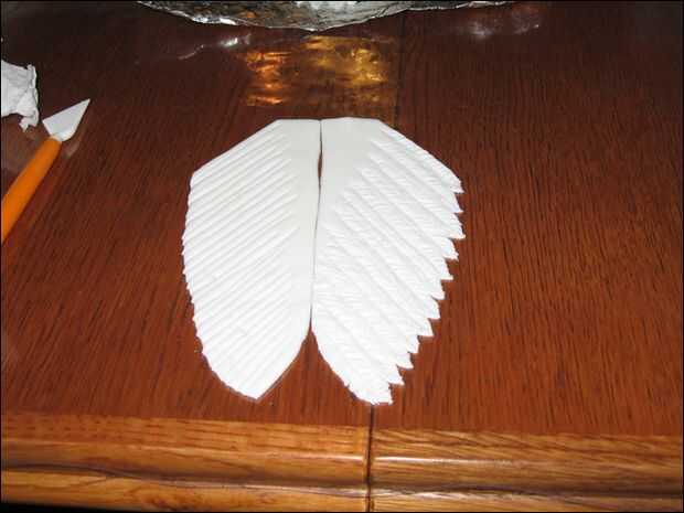 Luego encima eran plumas en la parte posterior ese ángulo en hacia el centro de su espalda y tipo de solapamiento. Estos hechos del mismo modo, una sola pieza para cada lado, hacer las líneas con la herramienta. Luego pegado en el.