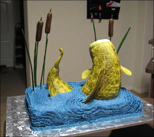hice mi 2ª tarta esculpida/3D y estoy muy feliz con él! Esto fue hecho para mi sobrino que está convirtiendo 12 y le encanta pescar y dijo que "fue puesto en esta tierra para pescar." También se unió a un club de pesca junior. El pescado sí mismo convites de krispie del arroz y entonces cubierto en el MMF y luego detallada y pintada a mano. La torta es fresa, sus favoritos, con crema de mantequilla. Hice la totora de goma de pegar. También hizo algunos señuelos, plomos y bobbers y ponerlos en cupcakes como decoración.