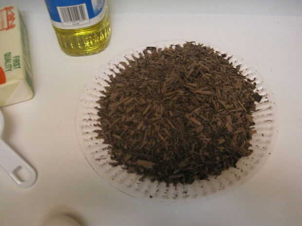 Ahora aplica tus rizos y virutas de chocolate en el exterior de la torta. usé mi mano llenado de virutas para presiónelas suavemente hacia los lados de la torta helada. una cuchara llenada de virutas funciona bien pero tarda más. Asegúrese de que cubrir completamente la torta entera.