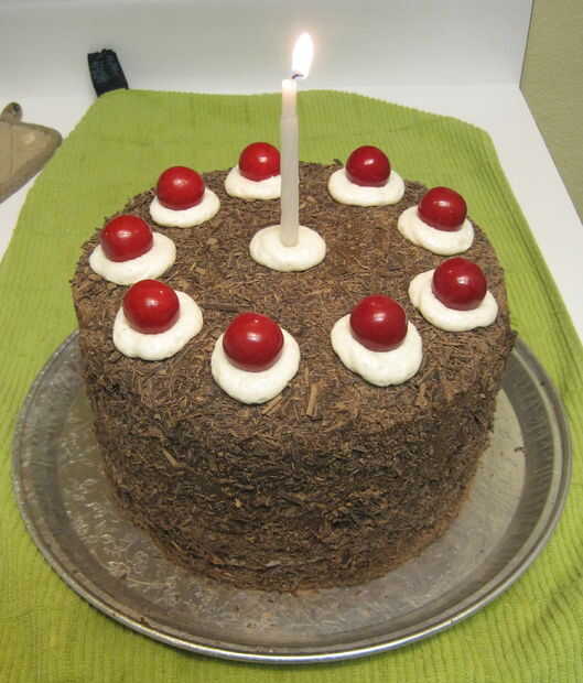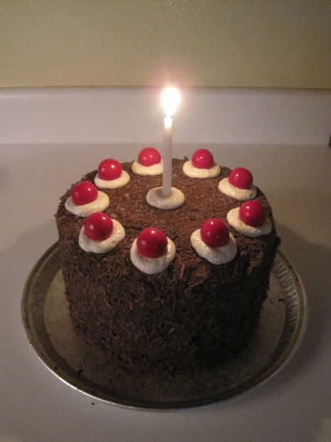 Usando su blanco guardado helar en su bolso con punta, coloque los círculos de glaseado uniformemente alrededor de la parte superior de la torta. Coloque sus bolas de goma roja en el centro de cada punto de helar delicioso. poner una pequeña cantidad de betún en el centro de la torta y pegar la vela en el centro de la cubierta. luz y cantar la canción del Portal porque éste era de hecho un triunfo!