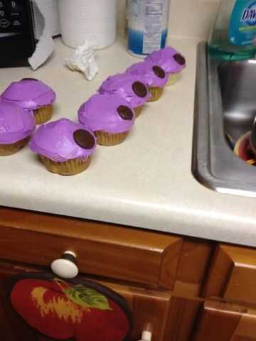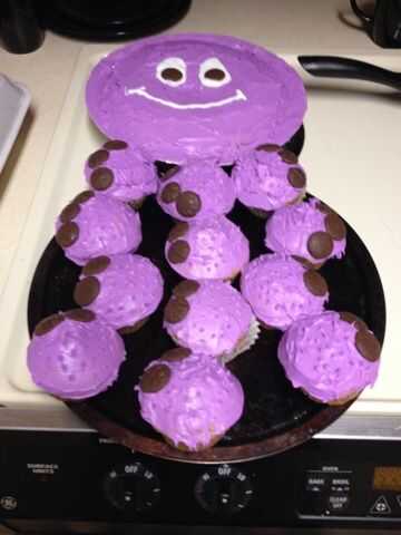 Después de glaseado cupcakes todas y añadir textura si se desea, colocan chocolate Hersey fundir discos a lo largo de la orilla de un lado de la Magdalena. Discos deben ser lugar de lado a lado. Ahora organizar magdalenas en forma de tentáculo. Magdalenas no deben ser en línea recta. También no habría más entonces cupcakes de cinco a siete por tentáculo.