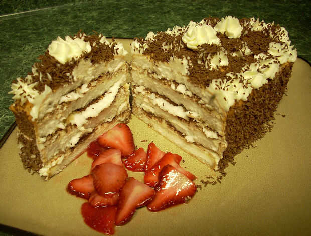 Nota: Las fresas son una adición muy importante. Unas láminas en el lado de la torta permiten un ocasional 'refrescante del paladar'. Oh, ¡ Ay Caramba, ¿sueno como un snob de la comida? Una pareja maravillosa! ¡ Disfrute!