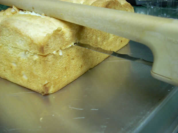 Cortar un pastel de Ángel en capas no es demasiado difícil, pero ayuda a tener una herramienta útil. Si usted no tiene un nivelador de pastel (muy barato, como unos pocos dólares en más tiendas que venden productos para hornear) puede utilizar un cuchillo de sierra, preferiblemente uno largo. Pan cuchillos o sierras son también una herramienta útil. Mi querido esposo encontró uno en una tienda de segunda mano y no podía estar más feliz. Sólo resulta de cortar la torta en tres rodajas de igual tamaños, y por un solo dólar, no me quejo que fue diseñado para zurdos.