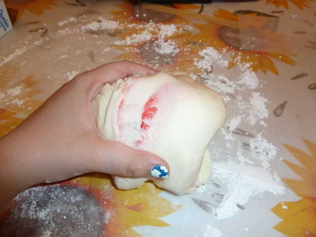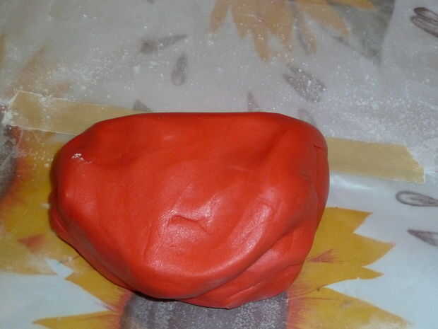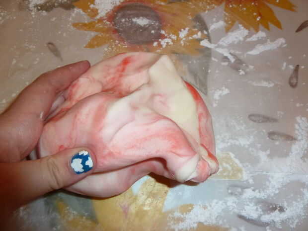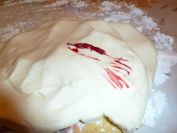 Mezcla de colorante rojo. Moje un palillo en el colorante y la "raspadura" él apagado en el fondant. Para ello, no tenga miedo de usar demasiado color porque es un pedazo tan grande de fondant, pero, como veremos más adelante, un poco de color va un largo camino. Siempre puede añadir más color, pero no puede quitársela.