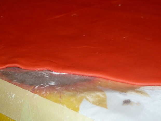 Esperar a que sobre una media hora para el pastillaje (fondant) obtener un poco más rígido, así no rompe tan fácilmente cuando la pones en la torta.