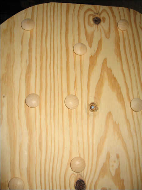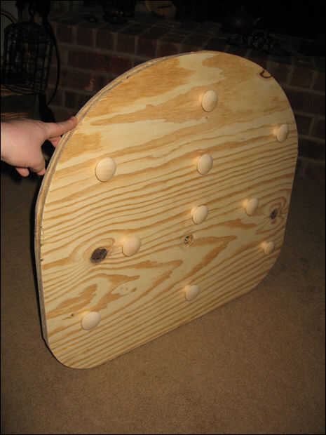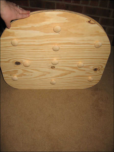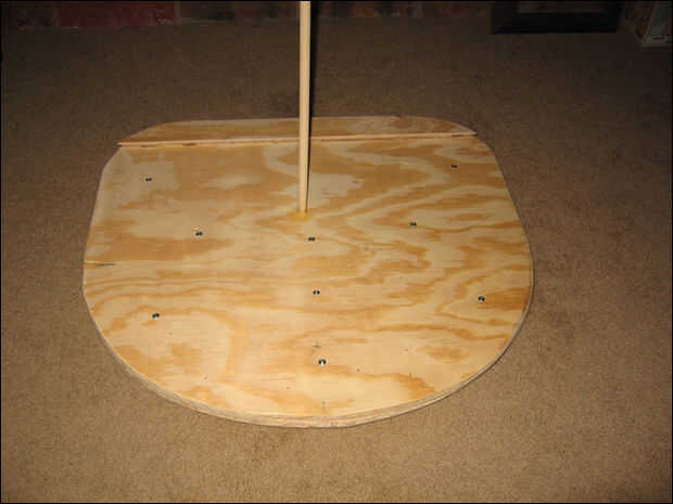 Una vez que estaba junto, lijar todo. Luego perforé un agujero en el centro donde yo quería mi pasador de soporte principal que, del mismo tamaño que el eje del tornillo de madera, pero más pequeño que la cabeza del tornillo. De este pasador de apoyo elegí una clavija de 1/2", 24" de largo puesto que la altura mínima para la competencia era 24". Hice un pequeño agujero en un extremo con una pequeña broca. Luego empujó mi tornillo de madera a través del orificio en la base de abajo y atornillar la espiga de soporte.