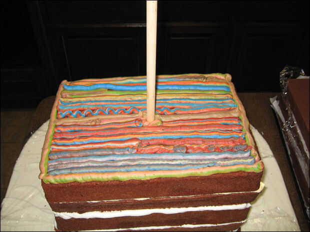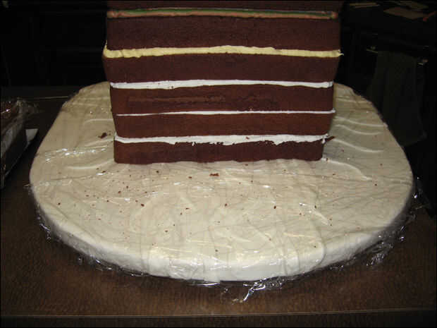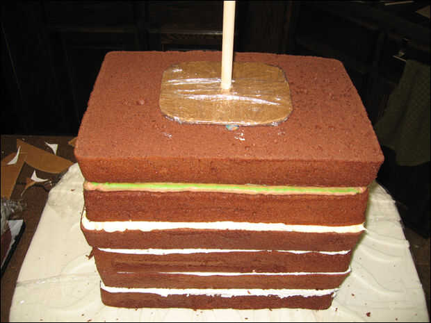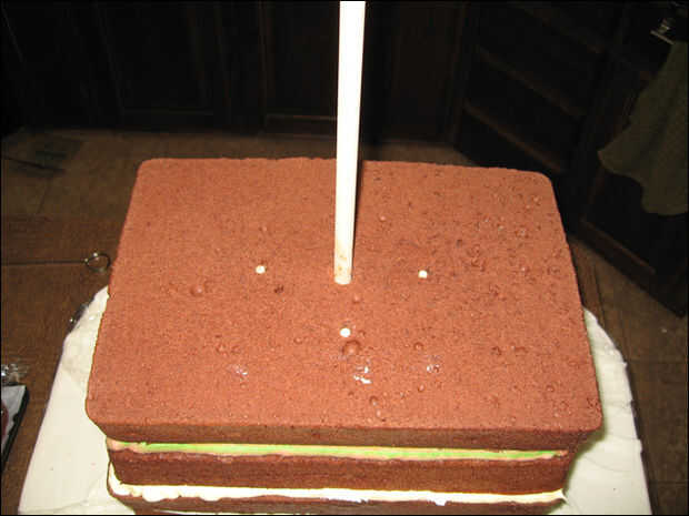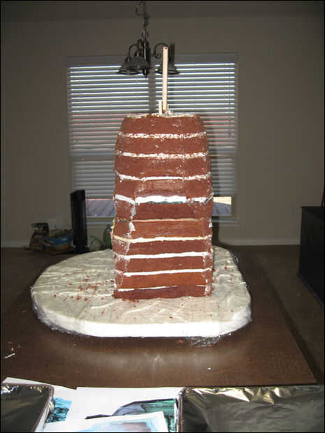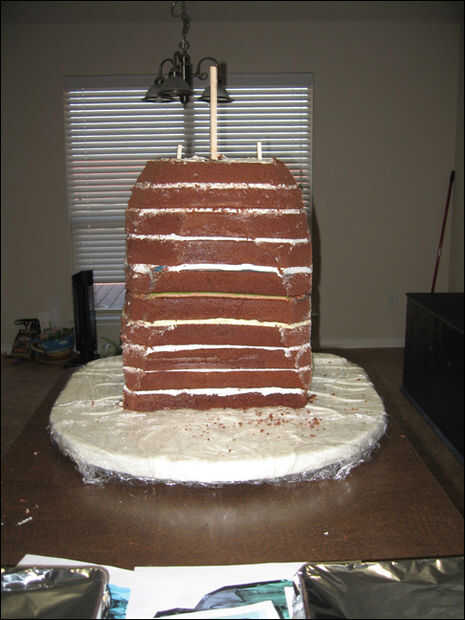 Apilan las tortas con crema de mantequilla entre los pasteles. Cada 4 pasteles Inserte las clavijas más pequeñas, cortadas a la misma altura de la parte superior de la torta de la capa superior y cortar un tablero de la torta del carboard, cubrirlo con una envoltura y colocarlo encima de la torta de espigas, para ayudar a ayuda él. Debería haber hecho esto mejor y con cada dos pasteles en lugar de cada cuatro y utiliza cartón ligeramente más grande y más grueso. Tal vez usando caliente pegamento en cola torta de cartón unos tableros juntos. Aprendizaje de soporte de la torta y este seguía siendo sin duda una experiencia de aprendizaje!