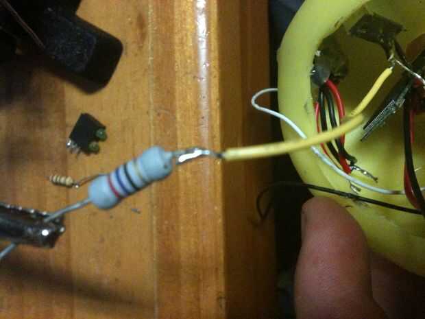 En el cable rojo extra, (que hemos soldados al cable positivo del USB) en uno de los cables del interruptor de la soldadura. En el otro interruptor de cable, soldadura en las resistencias 2 x 15 ohm en serie (en foto 3, el segundo resistor no se muestra)