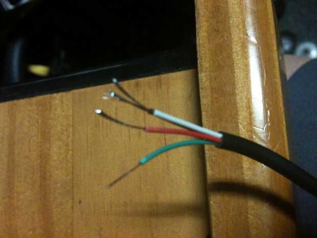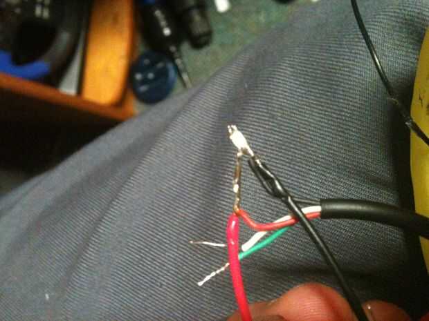 Antes de comenzar este paso, fundir un agujero en el extremo posterior de la pato y empuje el cable hacia el bien. Después de eso, tira el cable a revile 4 núcleos. Si tienes un cable con blindaje, cortar, porque no es necesario. Después de eso, la lata los cables correspondientes (como se muestra en foto 1) ahora a 2 pulgadas de longitud de color negro y una longitud de cable rojo para el correspondiente par de cables en el paquete de 4 cables de la soldadura. Asegúrese de que usted no conéctelos en línea. Usted verá por qué en un momento (replicar imagen 2)