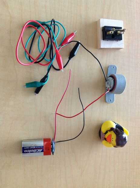 Usted va a necesitar: pinzas de clip de cocodrilo 3 - 1 cuchilla interruptor - 1 motor con montaje - 1 9 cables de la batería voltios con snap-on - 1 patito de goma de su elección - (opcionales)