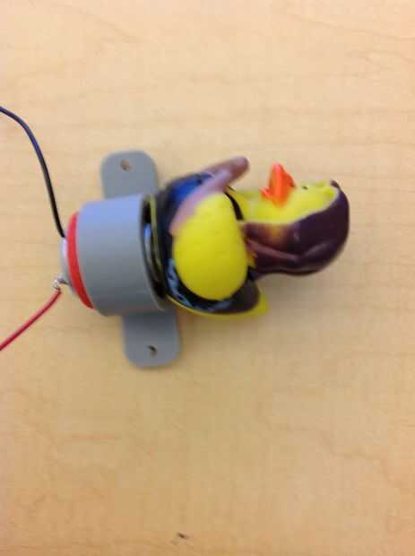 1. Si aún no existe un agujero en la parte inferior de su pato, hacer uno! 2. Presione el pato en el eje del motor. 3. puedes apoyar el motor entre dos tablas para facilitar el giro.