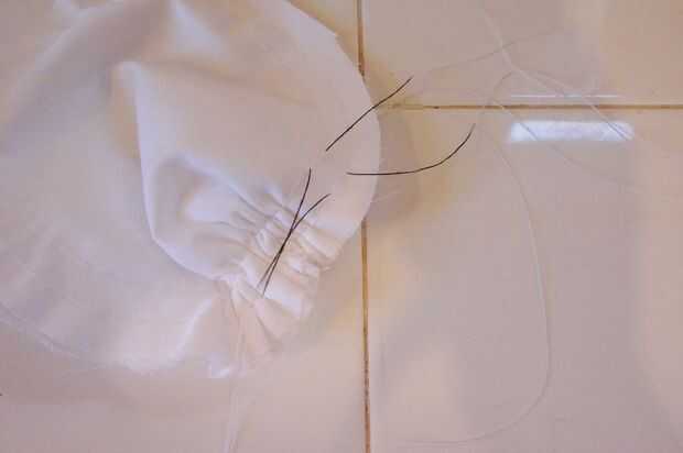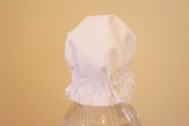 Recoger los hilos de rosca de la tapa 2 como se muestra y con cuidado tirar de los hilos para fruncir la parte superior del sombrero.