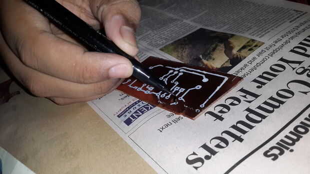 Después de calentar, lavar la placa con agua hasta que el papel es retirado completamente, ahora sólo líneas negras quedan en el tablero no quite las líneas. Después de eso si hay cualquier no transferido líneas entonces agarrar un marcador permanente y dibujar las líneas.