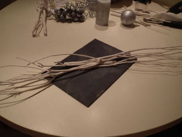Para el primer paso, usted tiene que pegar ramas, coloreados o no (ramas artificiales, como aquí, o ramas real, naturales o pintados), cortadas al tamaño que quieras con el cuchillo.