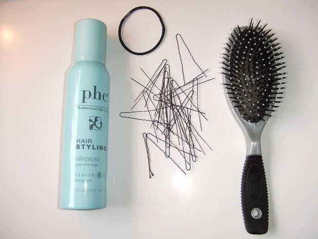 Espuma verde musgo, horquillas, laca/espuma, un elástico del pelo y un cepillo para el pelo. Decoración: Mariposas de una decoración de flor o cualquier cosa que usted puede encontrar.