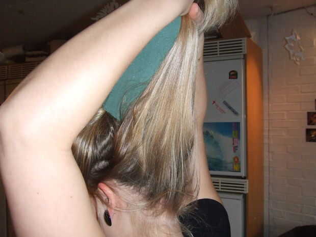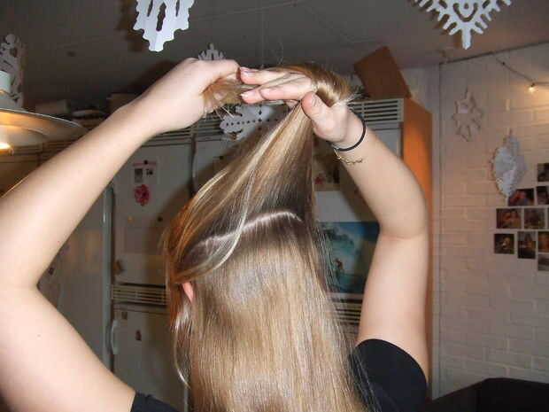 Parte tu cabello en la parte posterior de la cabeza y atar el cabello en el frente de la partida en una tuerca.