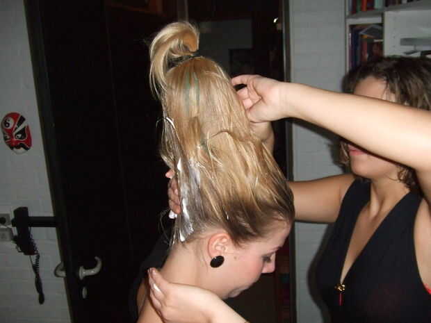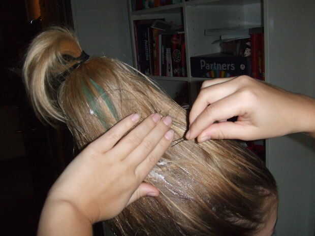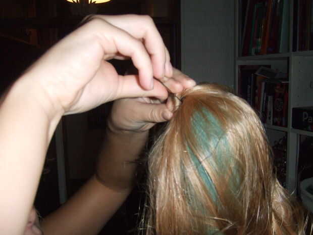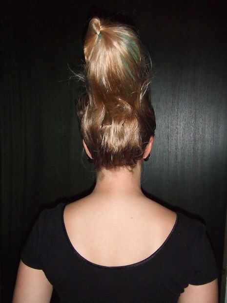 Poner horquillas y hairfoam en el pelo así todo se mantiene en su lugar y luego esconder la cola de caballo.
