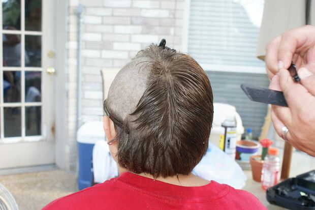 tomar su maquinilla de afeitar y sacar todos los guardias. Usted quiere cortar tan cerca de la piel como posible aquí. No dejes que el cabello sea demasiado húmedo o goma para arriba en los esquileos y 'morder' el sujeto. Si esto sucede, limpie la afeitadora, secar el pelo de temas un poco y lo huelen en la 5El la parte posterior de la cabeza y gritar 'tomarlo como un hombre'
