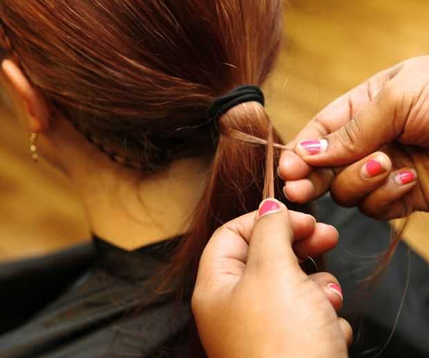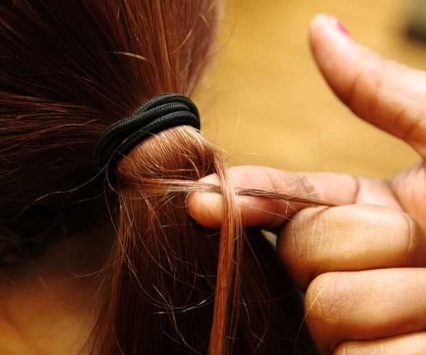 Seguir agarrando por detrás de la cola de caballo y llevar la hebra a través de. Sujete los hilos con cada mano.